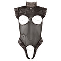 Cottelli Cupless and Crotchless sheer Body with lace trim on the arms and collar. 2 buttons back and leg openings. Breast and crotch are decorated and open with removable chain.